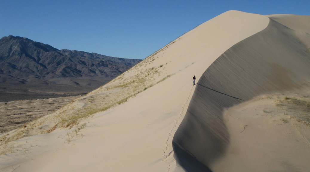 Rings Loop Trail requires metal handholds to navigate a narrow canyon, plus climb Kelso Dunes
