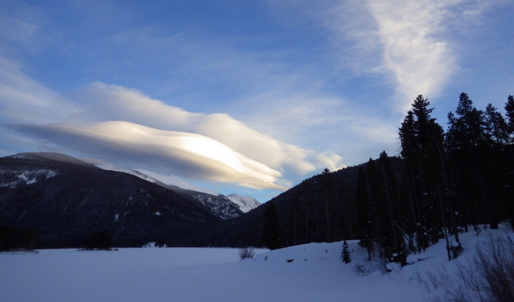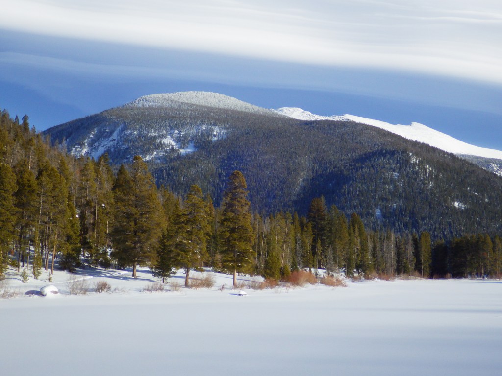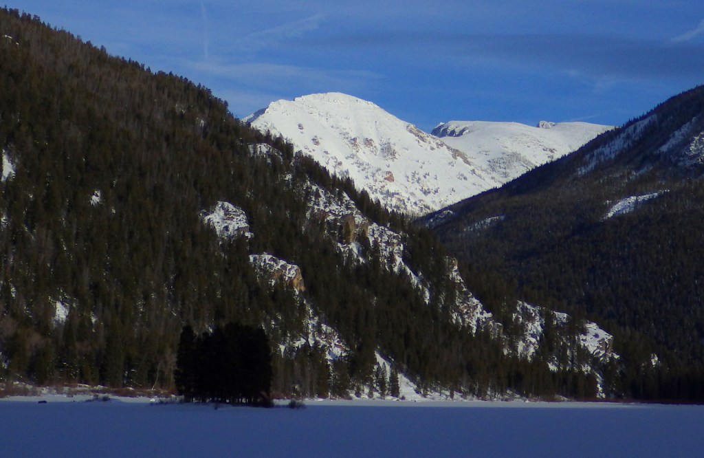Under a blanket of snow, there is a majestic view from Monarch Lake looking at the Arapaho Creek Valley.