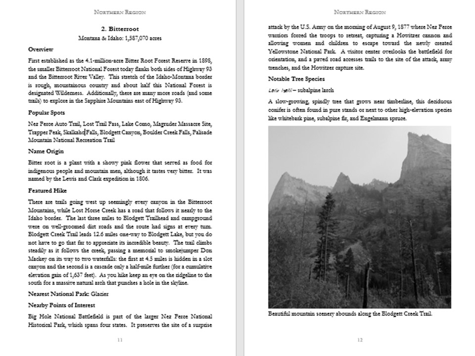 If you go to our book page on Amazon (https://amzn.to/3LSeey2) click on the cover image to Look Inside and read the introduction. Below is an example of the layout for all 155 National Forests.