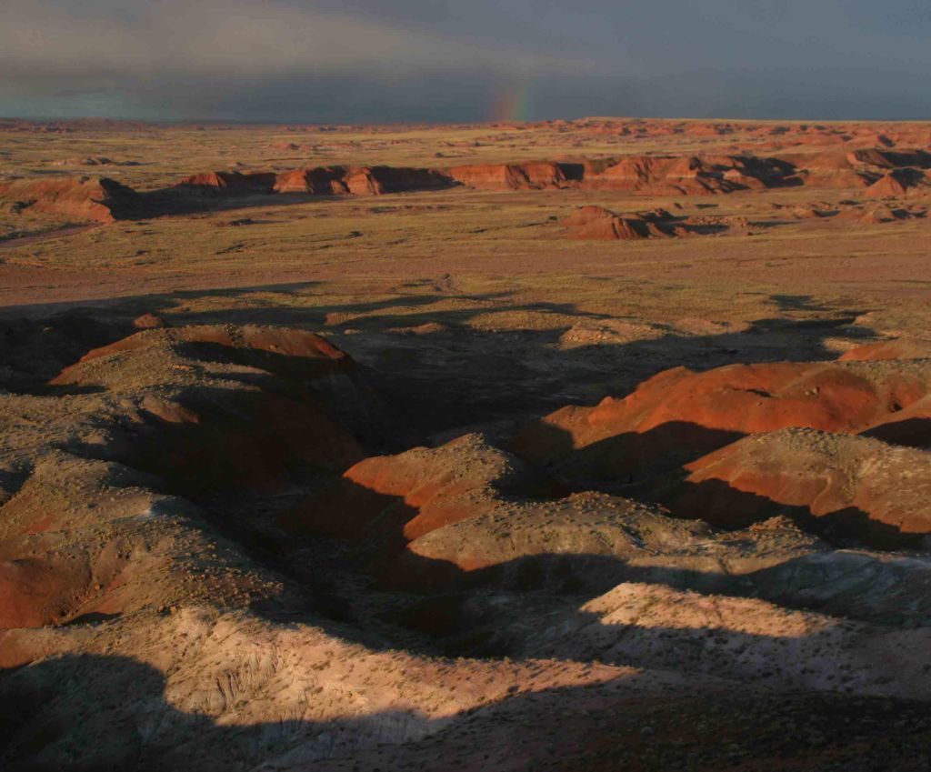 The Painted Desert often lives up to its name during the golden hours of sunrise and sunset when the pink adobe walls of the Painted Desert Inn can positively blaze. After summer thunderstorms, watch for rainbows that hang under the billowy cumulus clouds.