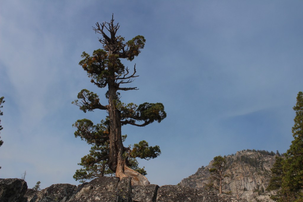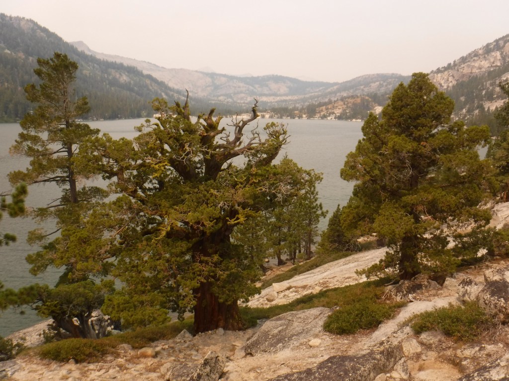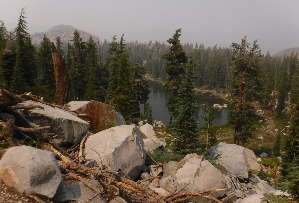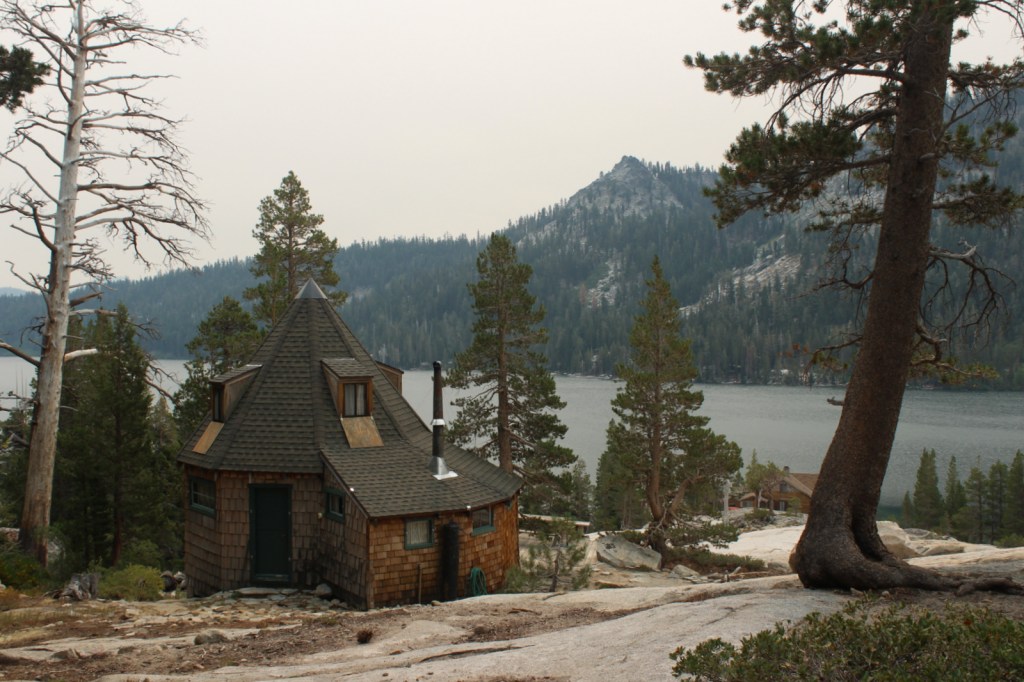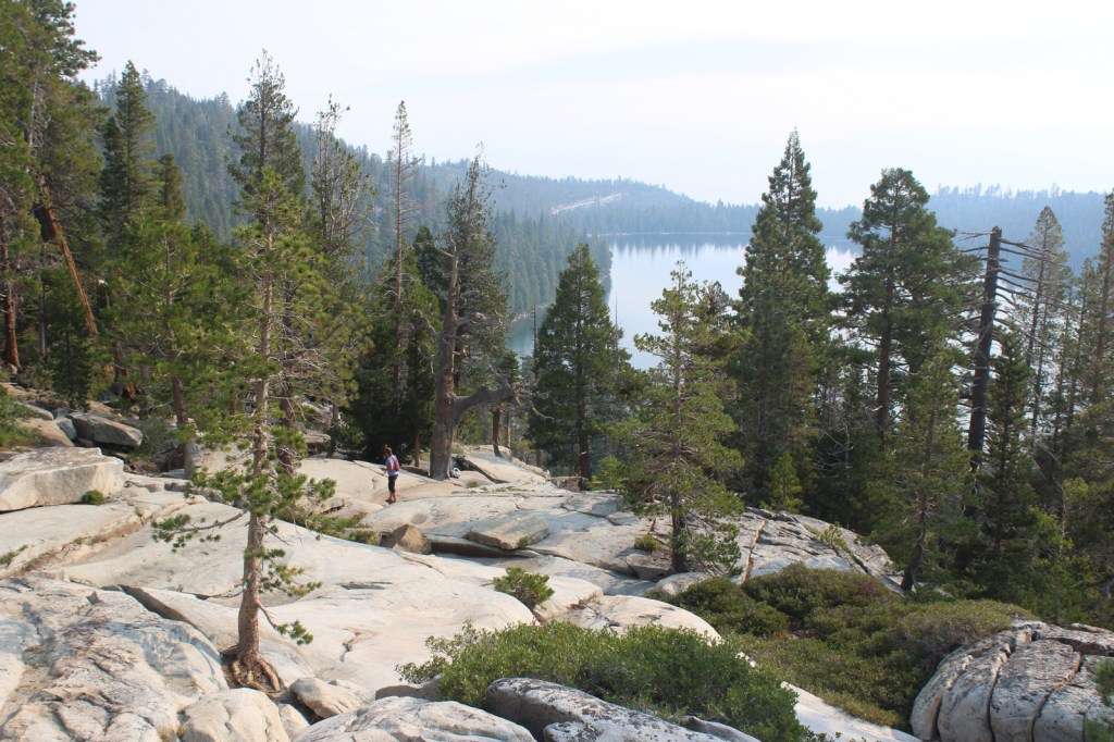 Near the National Forest’s border with Lake Tahoe, the 63,960-acre Desolation Wilderness is the country’s most visited Wilderness area on a per acre basis. With the exception of thru-hikers on the Tahoe Rim and Pacific Crest Trails, a daily quota limits the number of backpackers in the Desolation Wilderness. Even day hikers are required to carry a permit and a bear box is recommended for all overnight users. We took a smoke-obscured hike five miles one-way from Lower Echo Lake up to Lake Aloha in the Desolation Wilderness, a popular stop for backpackers.