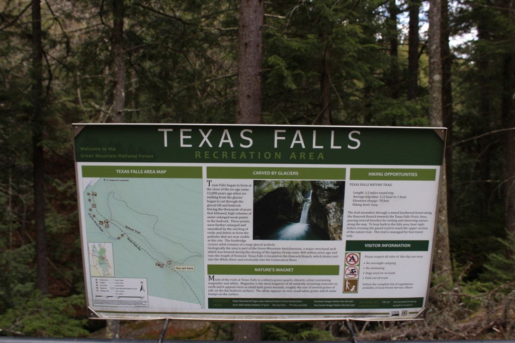 Texas Falls is not located in the right place on the Forest Service visitor app, but it is easy to get to right alongside paved Texas Falls Road off State Route 125. The falls formed at the end of the Ice Age around 12,000 years ago, when meltwater scoured the quartz-chlorite schist. A footbridge crosses the Hancock Branch over an interesting glacial pothole in the rock, and a nature trail continues uphill forming a 1.2-mile loop. We did not make it to Lye Brook Falls or Moss Glen Falls, but found the off-trail Falls of Lana worth the effort (see Moosalamoo National Recreation Area).