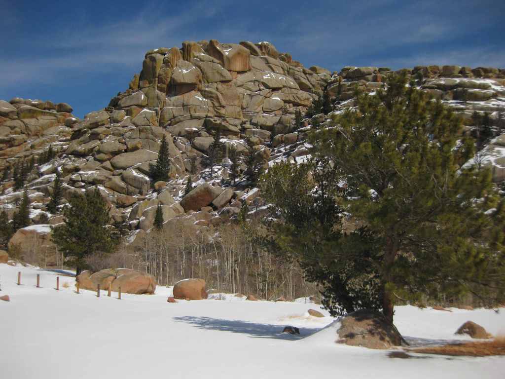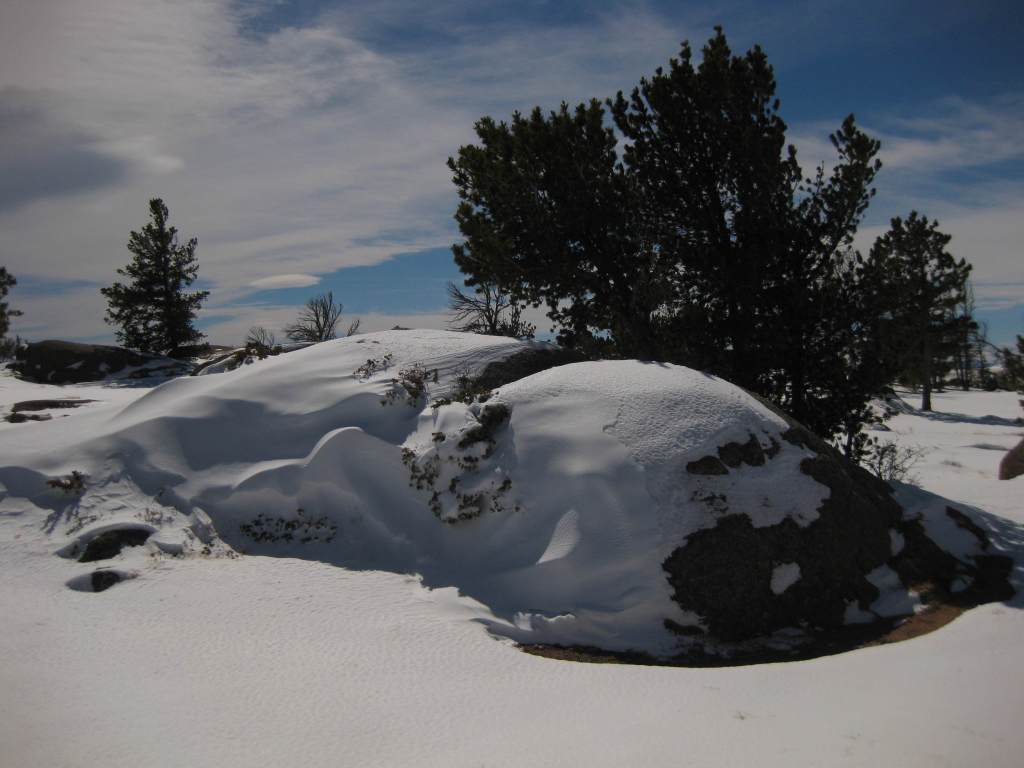 Vedauwoo Recreation Area is visible from Interstate 80 between Laramie and Cheyenne, but feels worlds apart. Its maze of boulders is a fun place to visit in the winter or summer (when the campground is open). The 3.2-mile Turtle Rock Trail circles the area, but it is more fun to climb around off trail. Near the end of winter, snow drifts pile six-feet-high next to ground swept bare. In the glens protected by the 200-foot-tall rock outcrops, snowflakes cling to the bare branches of aspen and maple trees, and stick in the needles of junipers, Douglas-firs, and ponderosa pines. Vedauwoo is an Arapaho word meaning “earthborn,” also the name of a nature spirit character in summer theater performances held here in the 1920s by the University of Wyoming. This forest was once depleted for telegraph poles and railroad ties before the Civilian Conservation Corps (CCC) planted 280,000 trees in the 1930s. It was used for over 50 years of military target practice, significant because there are unexploded munitions still in the ground. Vedauwoo is located near the Happy Jack Recreation Area, which at 8,640 feet is the highest point along Interstate 80 between San Francisco and New York City. This cross-country road was originally called the Lincoln Highway, hence the giant sculpture of Abraham Lincoln’s head at the nearby rest area.