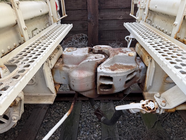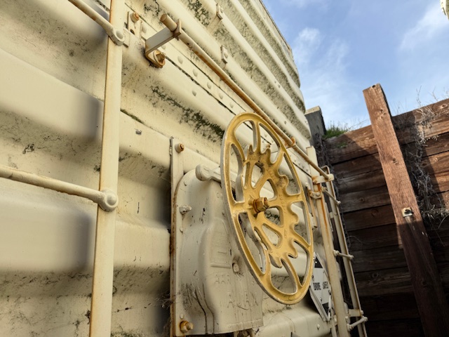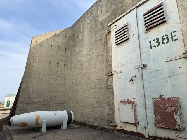 Shrapnel from the 1944 blast is located at the first stop on the guided tour where historic train cars are parked in a revetment.