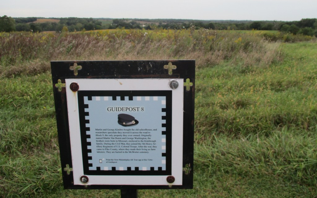 Where you park right off County Highway 2, there is an information kiosk that includes brochures and interpretive panels. We could not get the Augmented Reality (AR) Tour app to work when we visited, but you might have better luck if you use the public WiFi provided by the New Philadelphia Association (the WiFi password is Frank1836). You can always watch the AR videos before or after your visit on their website (http://newphiladelphiail.org/ar-website). If you want to stamp your National Parks passport, go four miles west to the Barry City Hall or public library, or visit Lincoln Home National Historic Site in Springfield.
