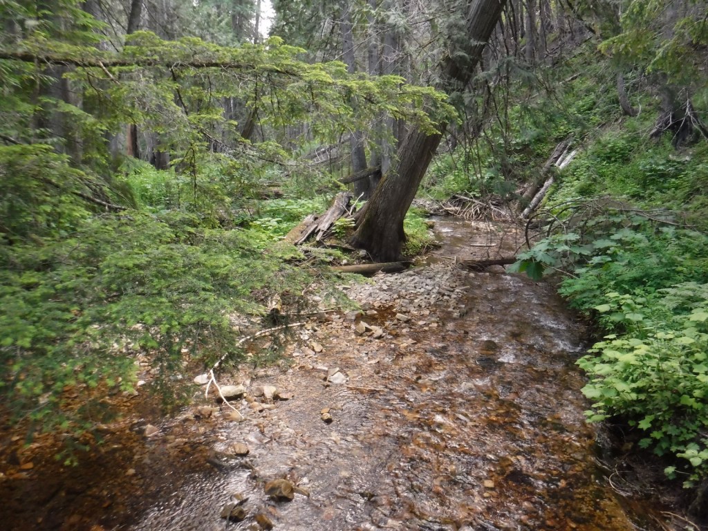 Even the paved roads we drove north of Wallace were slow going—very steep with hairpin switchbacks. Once we got on the unpaved road following the West Fork of Eagle Creek, it was wide and flat. We drove through Coeur d’Alene National Forest to access Bullion Pass on a four-wheel-drive-only road up a steep three-mile-long grade about a mile west (on a paved frontage road) from the Dena Mosa-Lookout Pass Rest Area on eastbound Interstate 90.