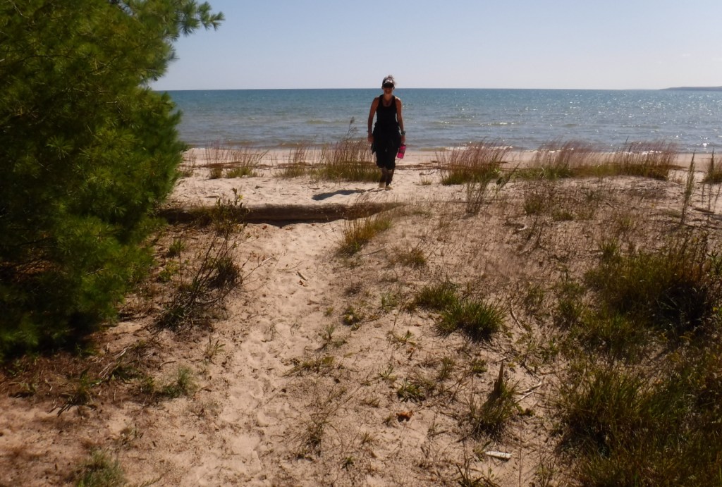 Foley Creek Day Use Area is located just off Interstate 75 at a large pullout along paved Mackinac Trail Road. A hike starts at the north end of a former campground, and soon the sound of the freeway is dispersed by the trees as you enter the small Horseshoe Bay Wilderness. The trail has boardwalks across the wettest spots and after 1.4 miles opens up to a secluded sandy beach on Lake Huron with views of Mackinac Island. Naomikong Point Blue Trail is a popular 3.4-mile out-and-back trail that connects with the North Country National Scenic Trail, crossing Naomikong Creek on a suspension bridge then ending at Menekaunee Point on Naomikong Island.