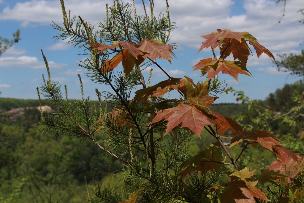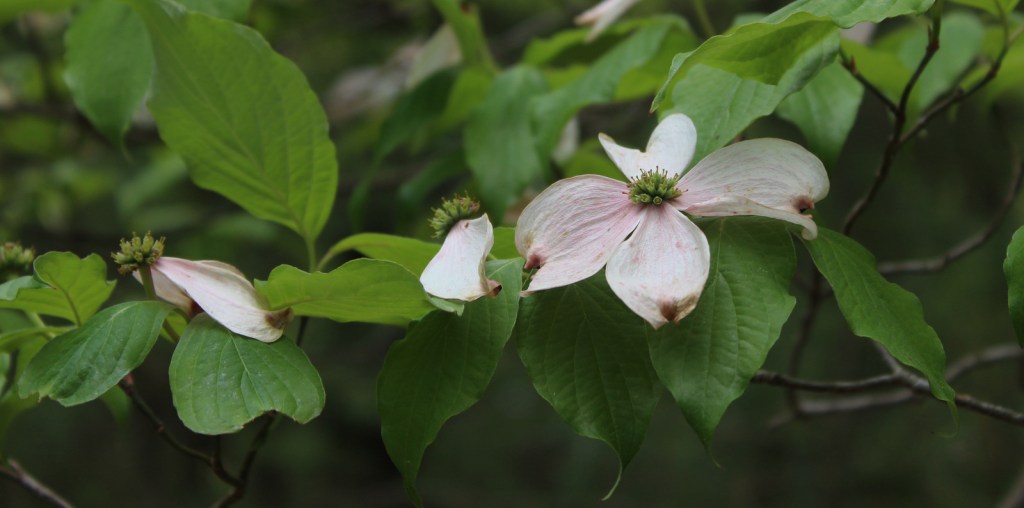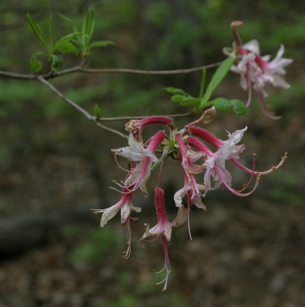 chestnut oak, scarlet oak, black oak, northern red oak, white oak, rock chestnut oak, tulip-poplar, American beech, mockernut hickory, bitternut hickory, pignut hickory, black gum, white ash, sassafras, mountain laurel, basswood, red mulberry, witch hazel, sugar maple, red maple, sourwood, cucumber magnolia, bigleaf magnolia, flowering dogwood, serviceberry, pawpaw, river birch, sycamore, silver maple, black willow, sweetgum, devil’s walkingtick, white rhododendron, Cumberland azalea