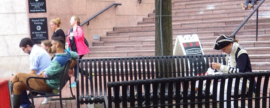The NPS does not utilize costumed volunteers, but you can hire a guide who does, plus pay to participate in your own tea party by chucking replica bundles into Boston Harbor