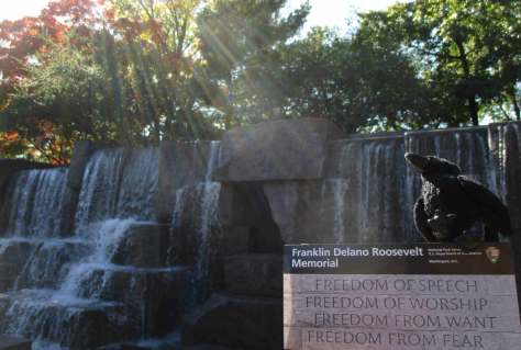 President Franklin Delano Roosevelt (FDR) dedicated the Thomas Jefferson Memorial on April 13, 1943, exactly 200 years after Jefferson’s birth. The nearby memorial to FDR is not such a grand and imposing coliseum, but is more approachable and unassuming as it winds past small waterfalls and statues depicting FDR’s four terms as President. Here two great Presidents are remembered in two very different, but equally eloquent ways.