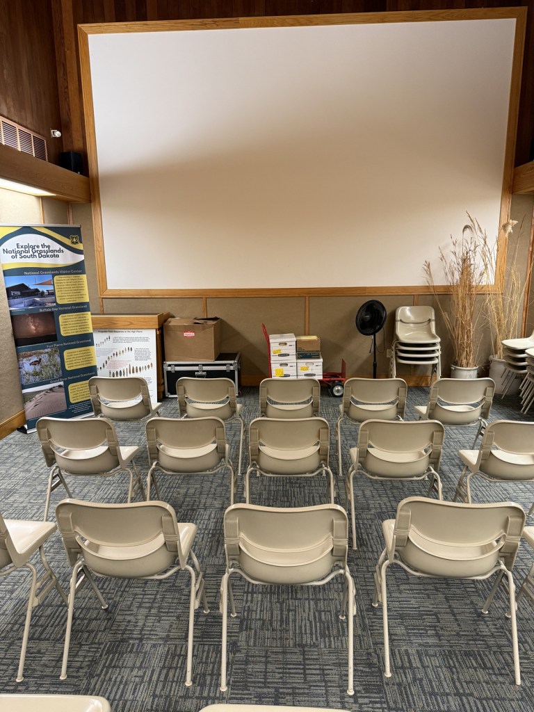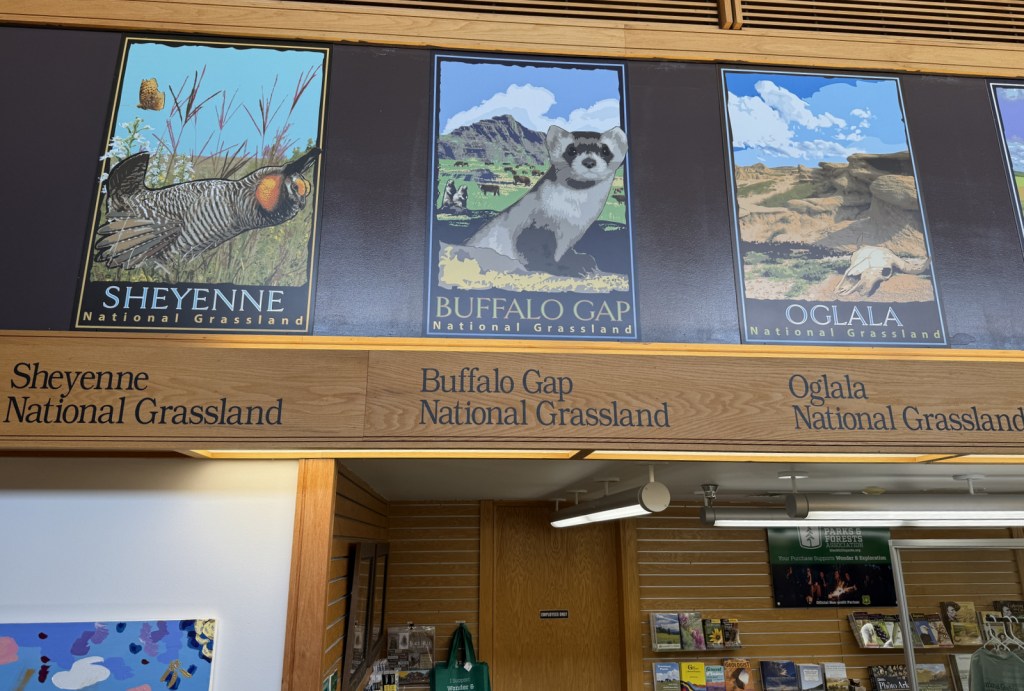 Buffalo Gap is the second-largest National Grassland and it surrounds Badlands National Park and Minuteman Missile National Historic Site east of Black Hills National Forest.  The town of Wall, South Dakota is home to the National Grasslands Visitor Center, which serves as the main interpretive site for all 20 National Grasslands (plus Midewin National Tallgrass Prairie).  The exhibit hall is still under reconstruction following a flood that forced a relocation into a temporary trailer for years, but the theater is reopened showing a short film.  This is a good spot to pick up a map and buy some hard-to-find National Grassland merchandise.